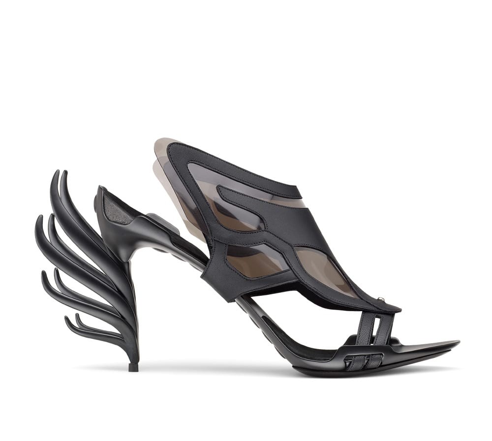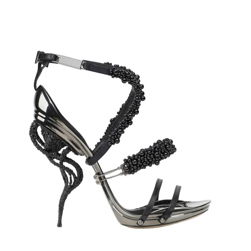 Tacchi scultura ispirati a soggetti del mondo animale, dettagli di ali, tentacoli, particelle che si muovono in un turbinio, pietre preziose. Strutture sofisticate e complesse, realizzate attraverso la modellazione tridimensionale computerizzata e riprodotta attraverso la sinterizzazione di titanio e lo stampaggio sottovuoto. Sculptured heels for women sandals inspired by animal world, wings details, tentacles, particles moving into a whirl, gem stones. Sophisticated and complex structures, built with three-dimensional computer modeling and reproduced through titanium sintering and vacuum casting.Client